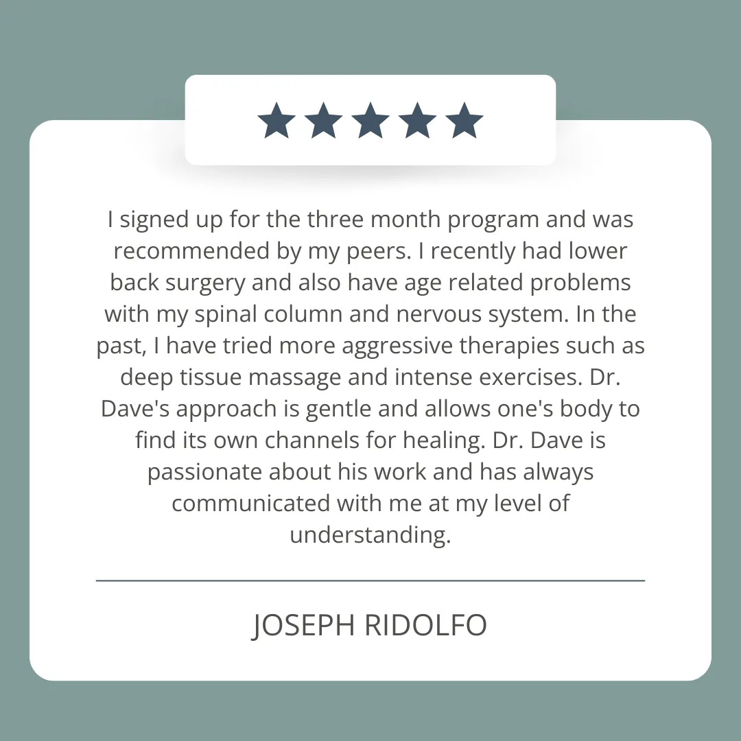 NetworkSpinal® uses gentle touch to release stored tension in the body, improving nervous system function. It reduces stress, increases energy, and fosters overall wellness.