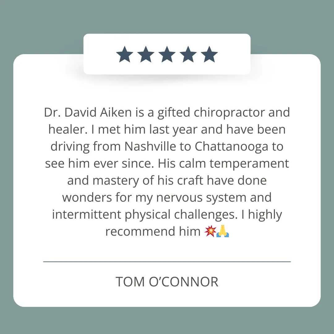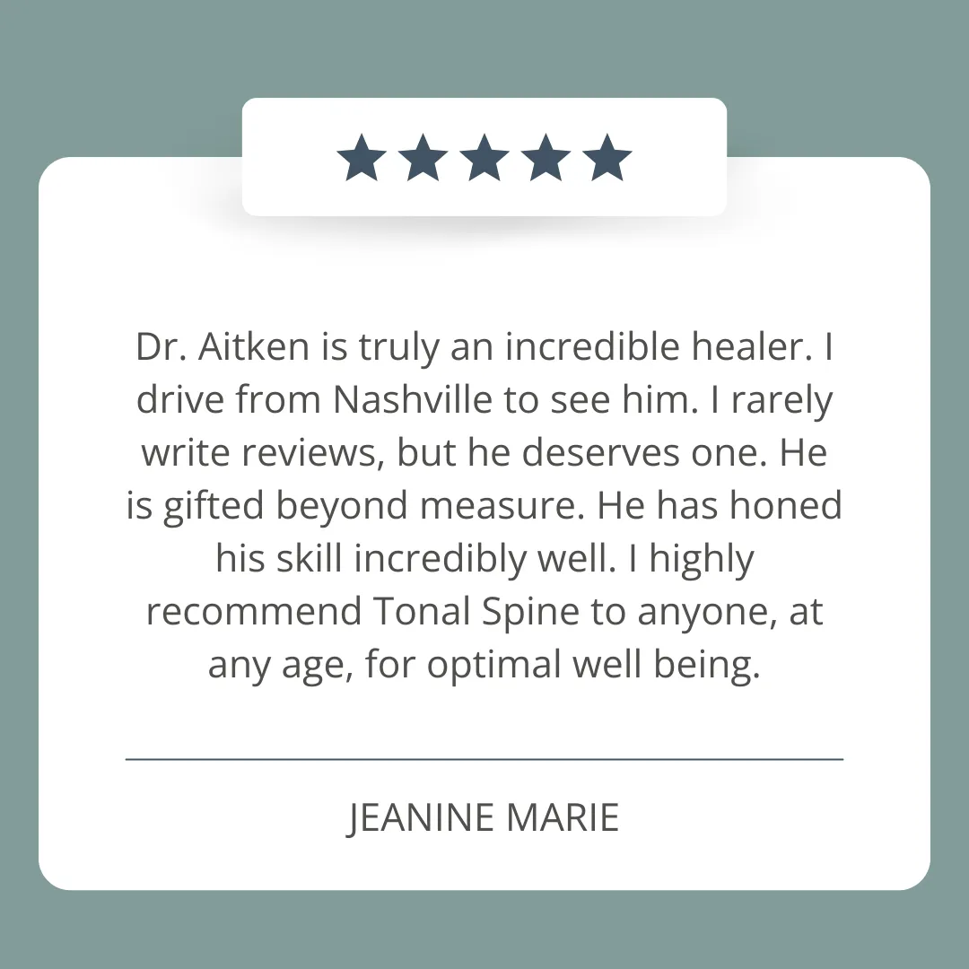 Hi, I'm Dr. David Aitken of Tonal Spine, serving Chattanooga since 2015 on the North Shore at Fraser and Woodland. Here, we view your nervous system as needing support, not as broken. We help with issues like back pain, headaches, anxiety, depression, and wellness optimization. Many experience not just symptom relief, but better sleep, clearer thinking, more energy, and an overall sense of ease. If you're looking for true healing, not a quick fix, book a 10-minute discovery call to see if Tonal Spine is right for you.